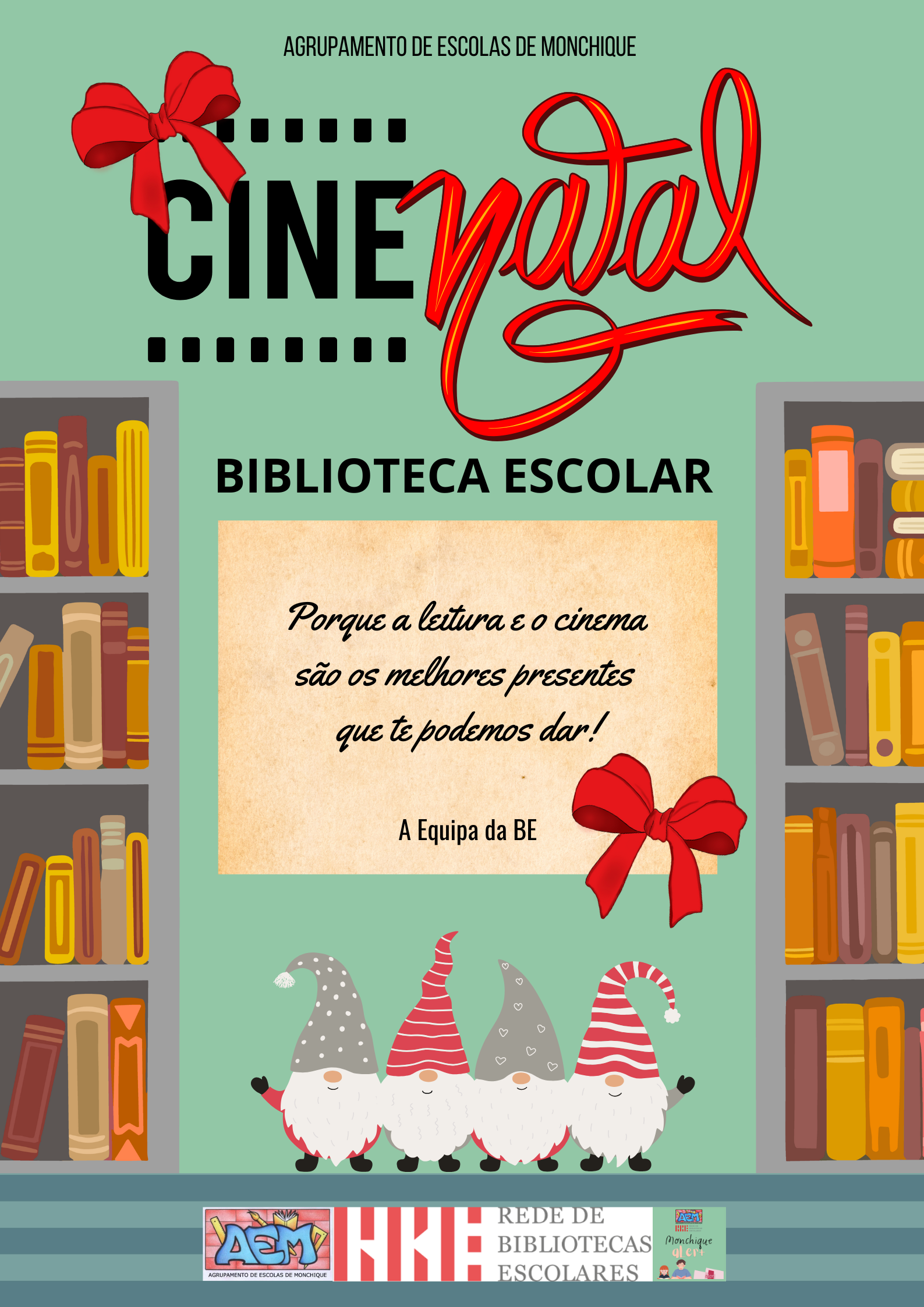 A Direção informa toda a comunidade educativa que, no âmbito das atividades de final de período, irá decorrer em todas as escolas do Agrupamento o CineNatal, uma iniciativa promovida e oferecida pela Biblioteca Escolar (BE), bastando para isso que os professores titulares marquem a sessão de cinema por email, Este endereço de email está protegido contra piratas. Necessita ativar o JavaScript para o visualizar.. Esta atividade tem como objetivo proporcionar um momento de partilha, convívio e valorização cultural, assinalando a época natalícia de forma educativa e descontraída.